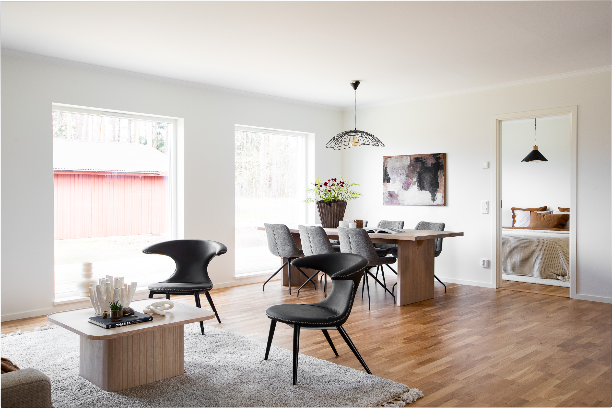 vilket skapar en luftig och inbjudande atmosfär – perfekt för familjeliv och sociala sammanhang.
