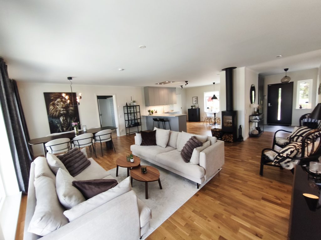 De rymliga och öppna ytorna gör huset till en naturlig samlingspunkt för familj och vänner. Här möts kök och vardagsrum i en harmonisk symbios.